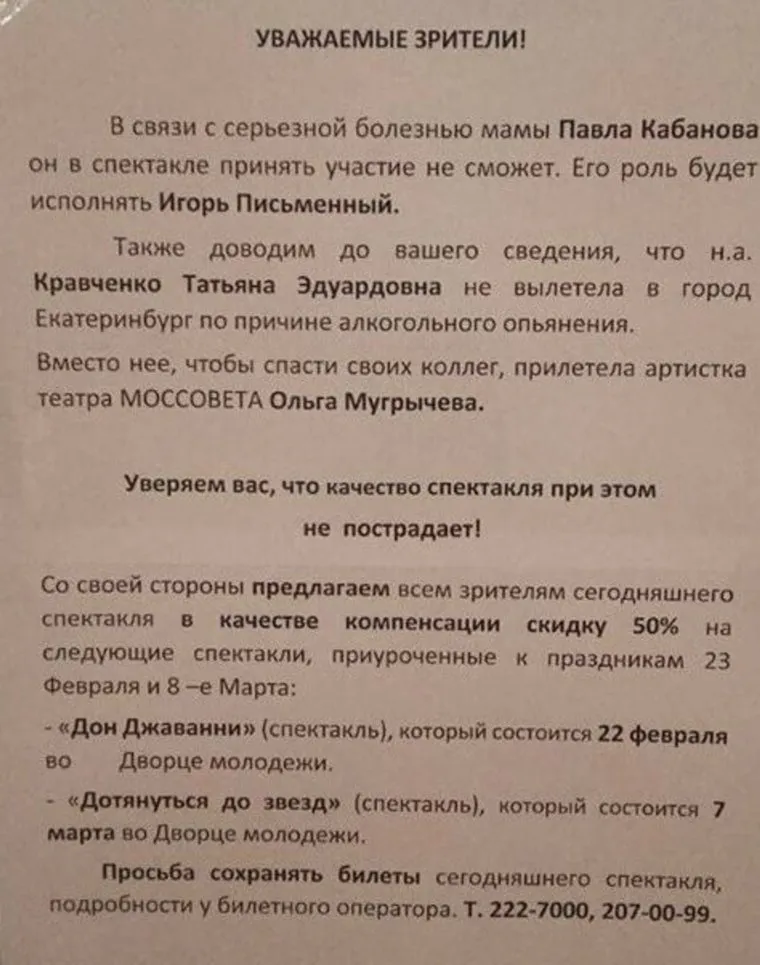 В Екатеринбурге оказался сорван спектакль «Здравствуйте, я ваша тёща» на площадке Дворца молодежи. Вместо ожидаемых московских артистов прилетели другие актеры, что возмутило зрителей.