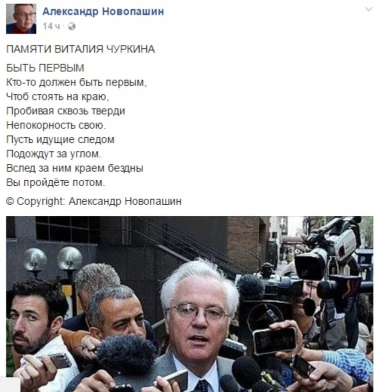 Известный тюменский поэт, советник губернатора Тюменской области Александр Новопашин написал произведение в память о постпреде РФ при ООН Виталии Чуркине, который скончался на рабочем месте за день до своего 65-летия.
