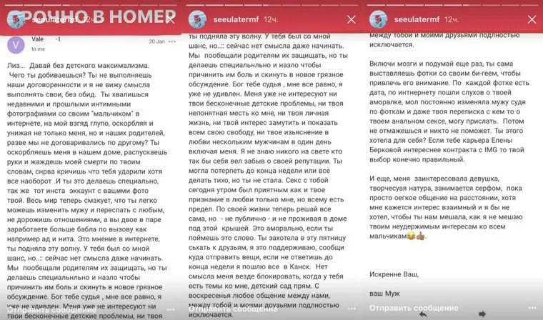 «У тебя был со мной шанс, но… Сейчас нет смысла даже начинать», — написал обманутый супруг. Он также предупредил, что в случае разлада ее контракт с модельным агентством IMG Models будет аннулирован. «Если тебе карьера Елены Берковой интереснее контракта с IMG, то твой выбор, конечно, правильный», — отмечает отправитель письма.