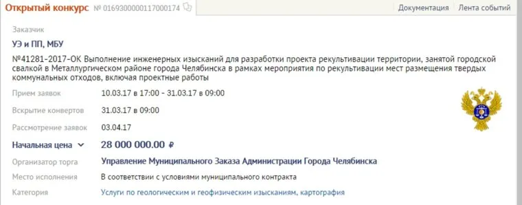 Электронные торги по теме «Выполнение инженерных изысканий для разработки проекта рекультивации территории, занятой городской свалкой в Металлургическом районе…» состоялись 31 марта. На открытом конкурсе разыгрывался лот стоимостью 28 млн рублей, заказчиками выступали управление материального заказа и управление экологии администрации Челябинска. Из 10 заявок были отклонены три — концерна «Недра» (Свердловская область), ОАО «Челябтяжмашпроект» и ОАО «Челябгипромез». Торги выиграло ООО «Донпроект» из Ростовской области.