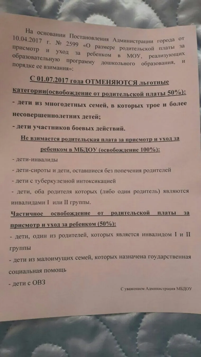 В социальных сетях Югры обсуждается постановление об отмене льгот, которое, как утверждается, выпустила администрация Сургута. Согласно опубликованному документу, дети из многодетных семей (трое и более несовершеннолетних), а также дети участников боевых действий, более не смогут пользоваться 50-процентным освобождением от родительской платы в детсадах. Норма должна вступить в силу с 1 июля 2017 года.