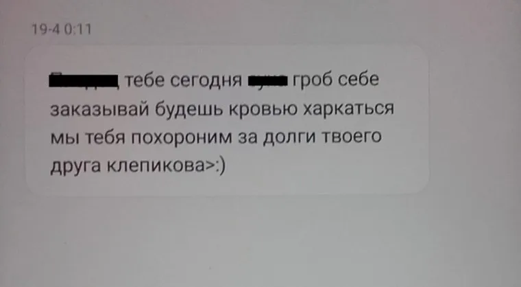 «В 00.24 ночи на мой номер позвонил неизвестный мне мужчина. Трубку взял муж, а потом передал мне. И тут посыпались страшные угрозы в мой адрес. Он уточнил, что звонит по поводу задолженности Клепикова — это мой отчим. Я сама заемщиком не являюсь, но расправа надо мной гарантирована из-за его долга в «Домашних деньгах», — рассказала «URA.RU» Екатерина Х.