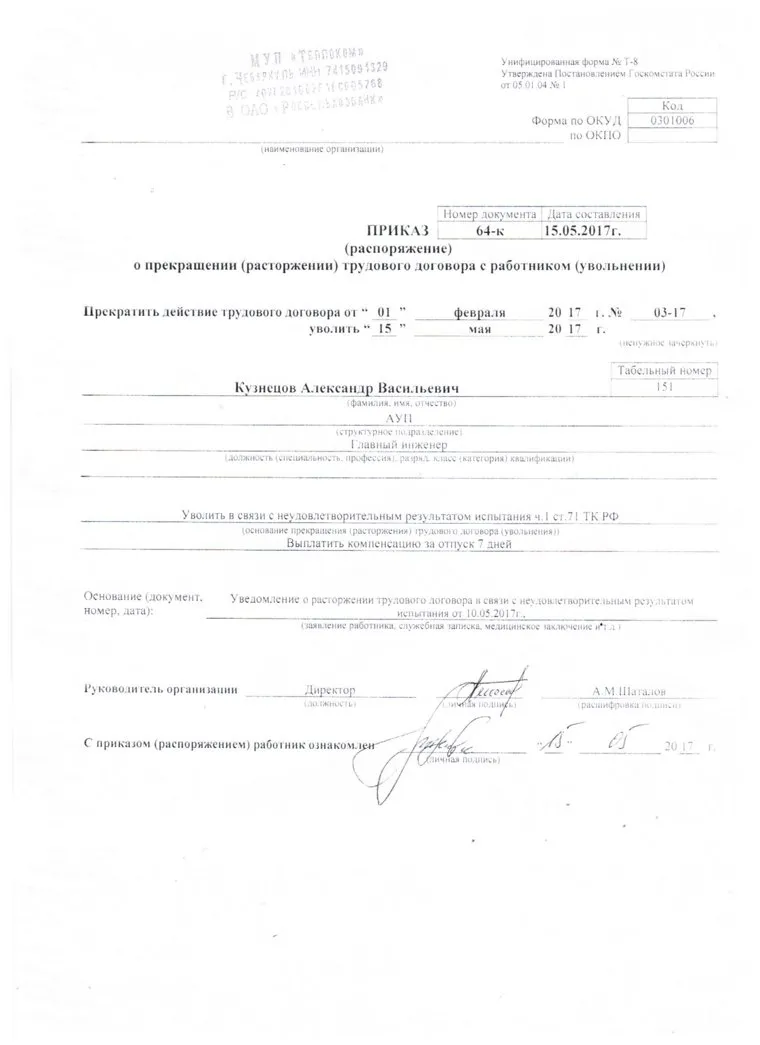 Чебаркульский МУП «Теплоком» уволил главного инженера и депутата горсобрания Александра Кузнецова, как не прошедшего испытания при приеме на работу (ст.71 Трудового кодекса РФ). Парламентарий считает, что этим ему отомстили за критику чиновников мэрии, и намерен восстановиться через суд, сообщил он корреспонденту «URA.RU».