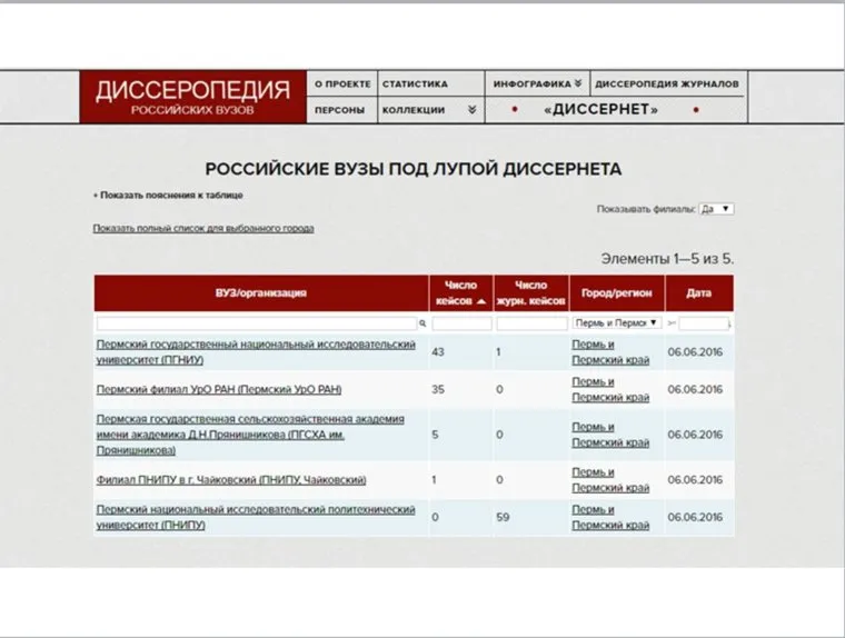Кстати, лидером по таким защитам, по результатам проверки пермского «Диссернета», является ПГНИУ. На втором месте — филиал УРО РАН, на третьем — ПГСХА. В ПНИПУ диссертационных нарушений на данный момент нет, правда, есть проблема со статьями в университетском журнале. Например, у вышеупомянутого Пыткина одна и та же работа вышла в журнале «Политеха» дважды: в 2012 и 2014 году. К слову, Пыткин, также как Цвикилевич, больше не является преподавателем ПНИПУ. Как пояснили представители вуза, вопрос об этих увольнениях стоял еще до расследований «Диссернета», но помощь активистов они оценивают очень высоко.