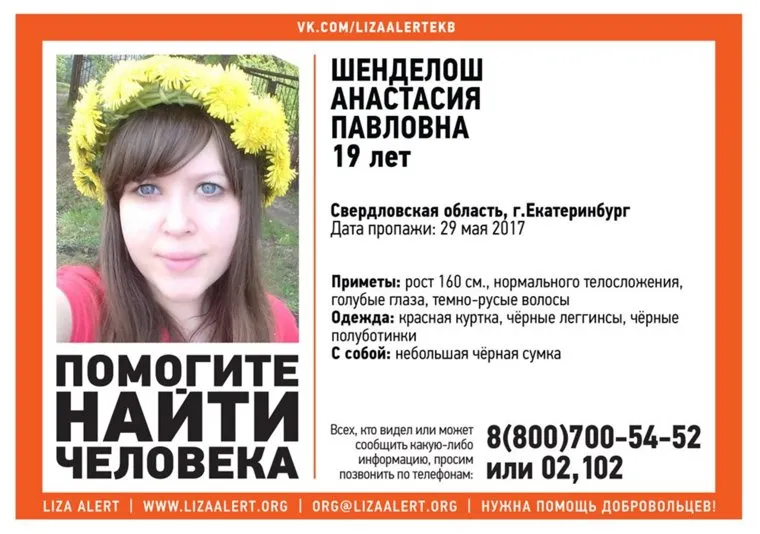 19-летняя Анастасия Шенделош пропала три дня назад по пути в екатеринбургский техникум химического машиностроения. Информация об исчезновении девушки активно распространяется в соцсетях. Поисковый отряд «Лиза Алерт» уже созывает добровольцев в помощь.