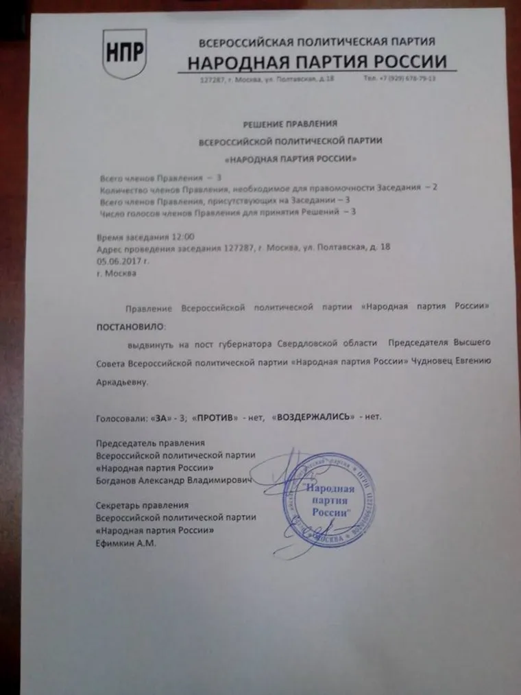 «Я не знала, что еду в партию — я ехала к политтехнологу [Вячеславу Смирнову, ведет собственный канал на YouTube] дать интервью о том, почему собралась в губернаторы, — рассказала Чудновец. — После интервью они предложили мне быть председателем — бумагу прислали (она есть у меня в „Фейсбуке“ (деятельность запрещена в РФ)). Теперь я председатель. Мы обсудили программу, у нас совпали некоторые пункты, мои шансы на выборах они оценили высоко».