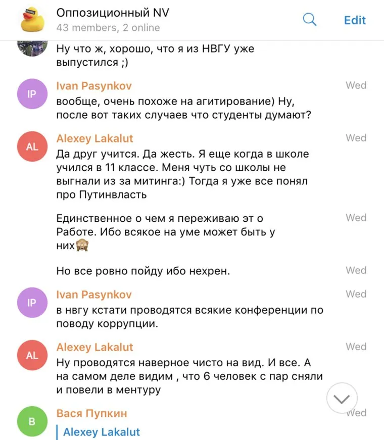 «Сначала нам говорили, что митингом мы ничего не добьемся, тупо [потратим впустую] время. Далее нам втирали. что из 5 000 студентов таких [глупых, достойных презрения людей] (которые за Навального) всего пятеро, все остальные за действующую власть. Дальше нам сказали, что эта беседа анонимна, у нас в корпусах никто об этом не узнает (для нашей же безопасности, мало ли, патриоты побьют). Потом начали задвигать, что в СССР было [очень хорошо, прекрасно, великолепно], и что от революции не стоит ждать хороших перемен и власти (Ленин бы поспорил). Ну, а на десерт, Навальный — американский агент, Путин — наш повелитель», — пишет один из сторонников оппозиционера, употребляя нецензурные выражения.