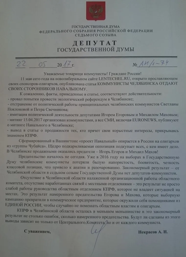 В письме говорится, что председатель обкома Игорь Егоров и депутат Заксобрания области Михаил Махов «оказались предателями» и фактически «слили» экологический протест в пользу «сформированного в Вашингтоне „проекта Навальный“, опирающегося в России на олигархов из „группы Чубайса“». Указана масса недочетов в работе, самым болезненным из которых стало поражение на последних выборах в Госдуму, где южноуральские коммунисты не получили ни одного мандата против двух депутатов в прошлом созыве. «Это результат намеренного предательства Егорова и Махова, которые выборную кампанию превратили в коммерческое предприятие и которые окружили себя помощниками из „Единой России“ чтобы случайно не помешать областным властям и олигархам», — утверждается в письме.