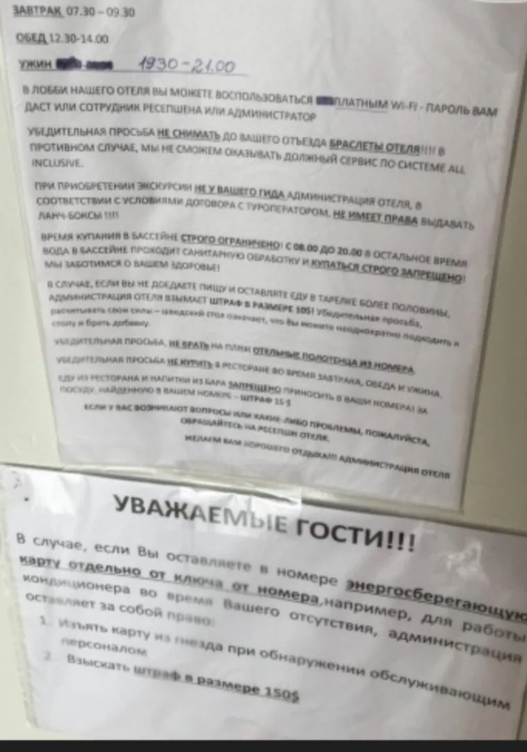 Фото правил турецкого отеля выложила в соцсети «ВКонтакте» Марьяна Лешукова. В объявлении отдыхающих просят рассчитывать свои силы и не брать больше, чем они способны съесть. За недоеденную со шведского стола еду гостей грозят штрафовать на 10 долларов.