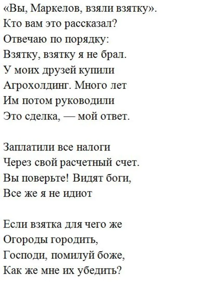 В стихах Маркелов надеется на помилование, которое является «прерогативой праведных государей», и заявляет, что он не брал взяток. «У моих друзей купили/ Агрохолдинг. Много лет /Им потом руководили /Это сделка, — мой ответ», — пишет в стихах арестованный экс-губернатор. По версии следствия, Маркелов пытался получить взятку в виде 250 млн рублей от учредителя местного агрохолдинга «Акашево» бизнесмена Николая Криваша.