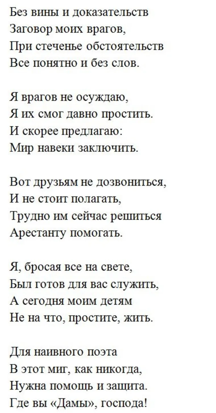 В поэтической форме Маркелов пытается доказать главе государства, что взятки не было, а была проведена законная сделка. Кроме того, он жалуется на то, что в тюрьме страшные условия содержания.
