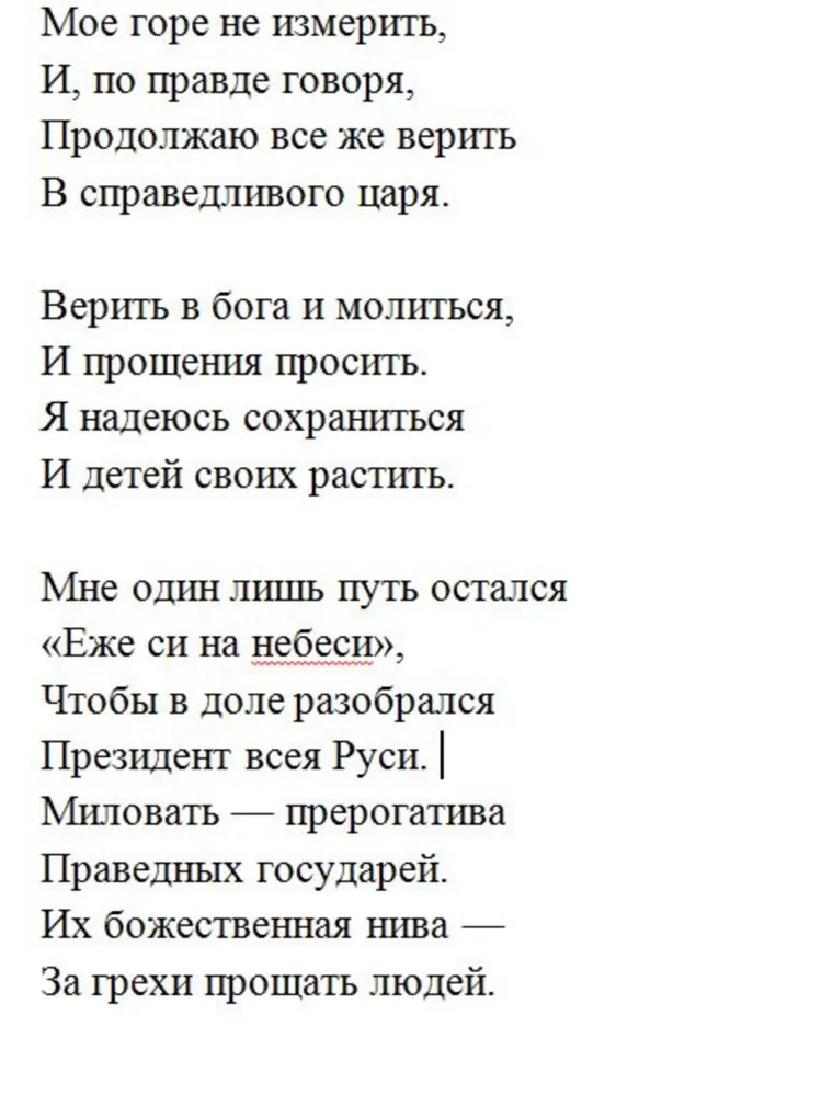 «Миловать — прерогатива / Праведных государей. Их божественная нива — / За грехи прощать людей», — завершает Маркелов стихотворение.
