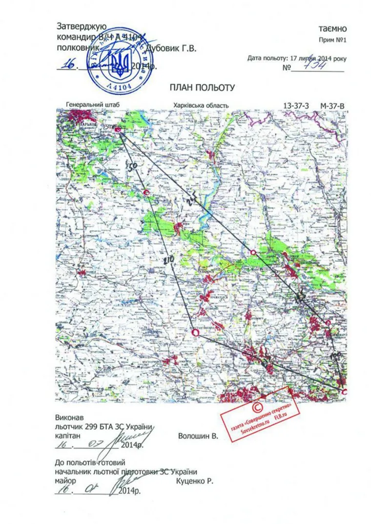 Секретный план полета был составлен и подписан за день до вылета, 16 июля 2014 года, летчиком 299-й бригады тактической авиации, капитаном Владиславом Волошиным, и утвержден командиром в/ч А4104, полковником Геннадием Дубовиком. Самолет Волошина, судя по карте, взлетел с аэродрома в городе Чугуев Харьковской области и направился в юго-восточном направлении. Траектория его полета пересекается с маршрутом малайзийского «Боинга».