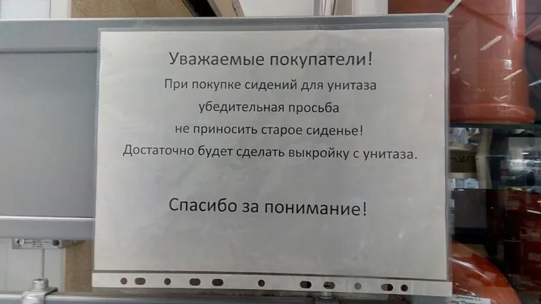 В сообществе «Подслушано Пермь» социальной сети «ВКонтакте» пользователи разместили фото с объявлением из магазина сантехники, находящемся в торговом центре «Радуга». В нем продавцы просят покупателей не приносить с собой из дома старые сиденья для унитаза и поясняют: чтобы выбрать новое, достаточно сделать выкройку.