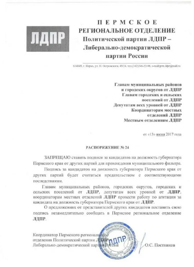 Собеседники из числа муниципальных депутатов рассказали, что в июне их коллеги либерал-демократы получили соответствующее распоряжение от координатора регионального отделения ЛДПР и лидера партийной фракции в Заксобрании Олега Постникова.