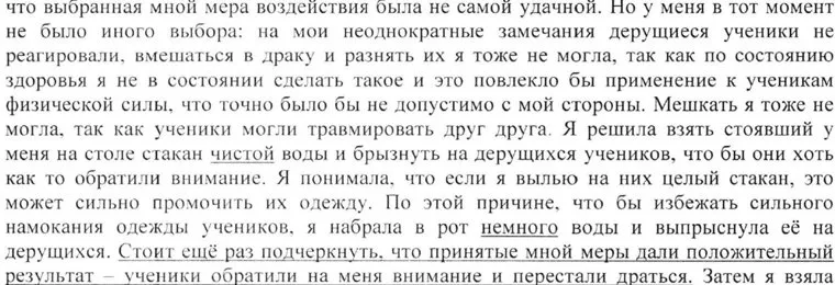 Преподаватель отмечает, что и мешкать она не могла — иначе ученики могли травмировать друг друга. «Я решила взять стоявший у меня на столе стакан чистой воды и брызнуть на дерущихся, — пишет учительница. — Я понимала, что если вылью на них целый стакан, это может сильно промочить их одежду… Я набрала в рот воды и выпрыснула ее на дерущихся. Принятые мной меры дали положительный результат — ученики обратили на меня внимание и перестали драться».