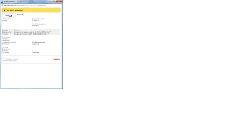 В екатеринбургском аэропорту «Кольцово» рейс 9695 компании Azur Air до Антальи задерживается более чем на восемь часов. Пассажиры должны были вылететь в Турцию в среду ночью в 3:30, но согласно онлайн-табло вылет ожидается не ранее чем в 11:40.