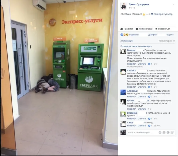Другие подписчики вспомнили, что им самим приходилось оказаться на месте бездомных. «Помню, ошибся с поездом в Германии, а городок маленький: вокзал закрыт, отелей нет, вообще ничего нет. Ночь, зима и ждать 5 часов. Помещение для банкоматов — удобное место: и отопление есть, и лавочка, и рекламу почитать», — рассказал Сергей.