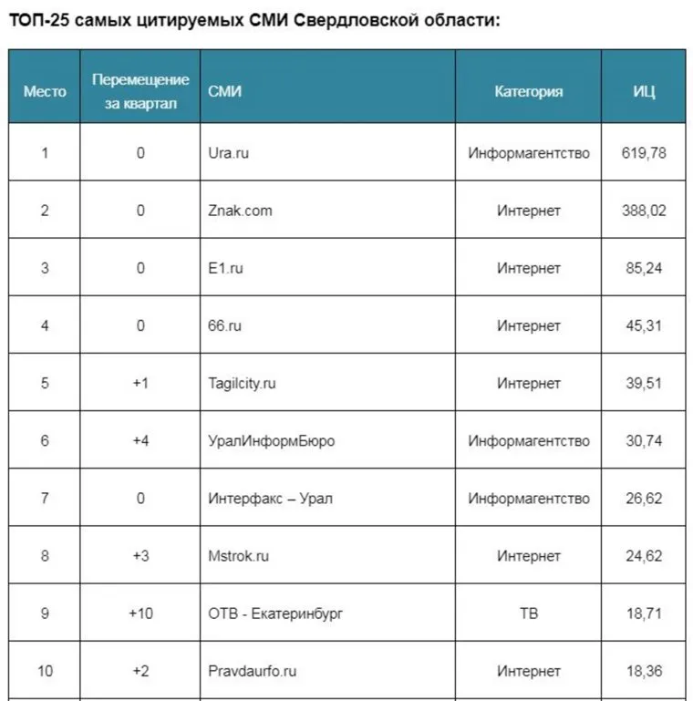 Спасибо, коллеги! «Медиалогия»: «URA.RU» два года сохраняет первое место по цитируемости среди свердловских СМИ. СКРИН