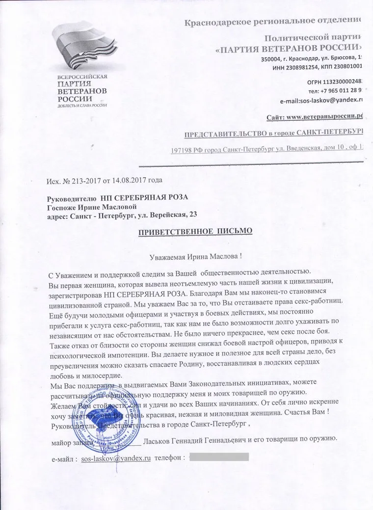 «Еще будучи молодыми офицерами и участвуя в боевых действиях, мы постоянно прибегали к услугам секс-работниц, так как не было возможности долго ухаживать по независящим от нас обстоятельствам, — говорится в письме. — Не было ничего прекраснее, чем секс после боя. Отказ от близости со стороны женщин снижал боевой настрой офицеров, приводя к психологической импотенции. Вы делаете нужное и полезное для всей страны дело, без преувеличения можно сказать, спасаете Родину, восстанавливая в людских сердцах любовь и милосердие».