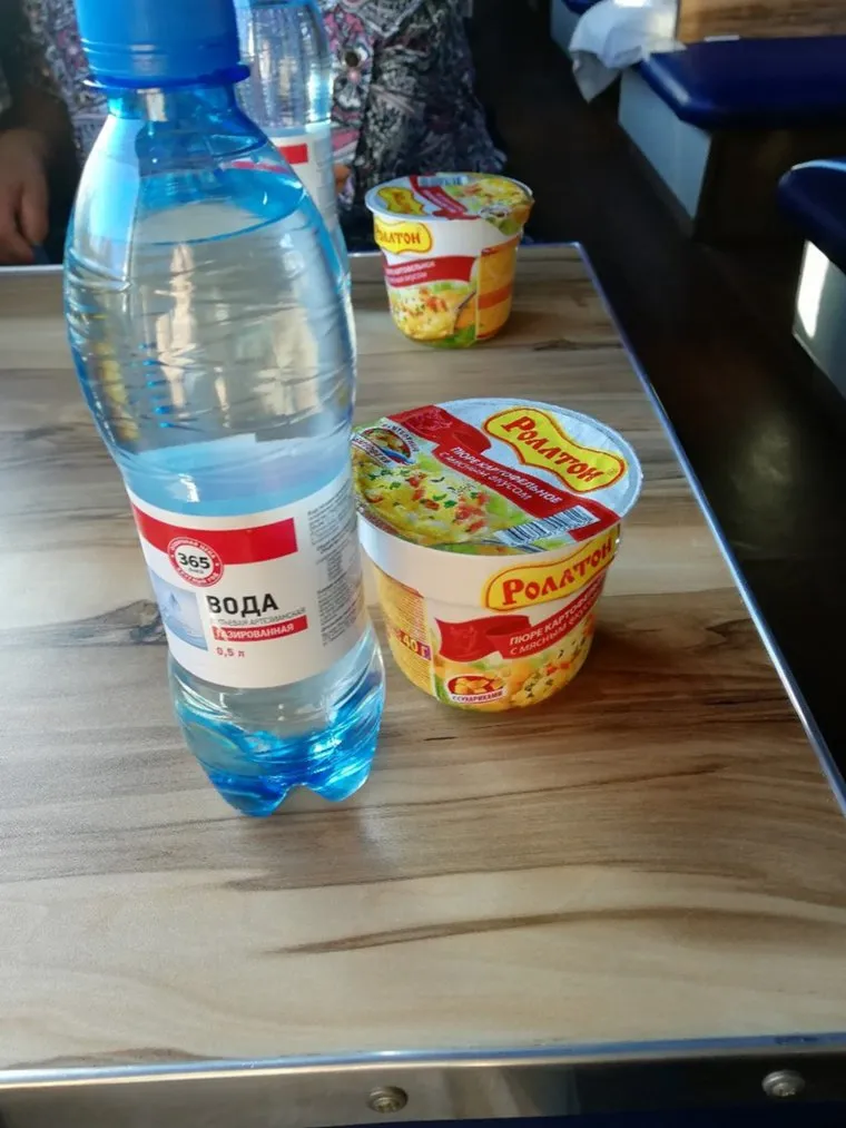 «А вот и наше питание, которым нас обеспечили. Около 8 часов мы стояли в лесу перед Сургутом. Продукты питания у многих уже закончились, стали спрашивать у начальника состава покормят ли нас, на что он ответил: „как же к нам доставят, на вертолете что ли?“. К слову, состав стоял на путях в непосредственной близости к автомобильной трассе. Спустя восемь часов мы все-таки приехали на станцию в Сургуте и вот такое питание нам предоставили», — комментирует Пушкарев.