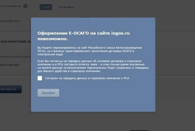 «Сообразив», что машинка — старая, сайт «Ингосстраха» выдал сообщение об ошибке и предложил обратиться в РСА