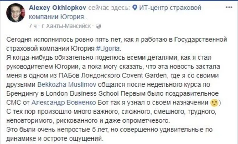 Алексей Охлопков, которого считают главным антикризисным менеджером правительства Натальи Комаровой, сообщил, что исполнилось ровно пять лет, как он работает в ГСК «Югория». «Я когда-нибудь обязательно поделюсь всеми деталями, как я стал руководителем Югории, а пока могу сказать, что эта новость застала меня в одном из ПАБов Лондонского Covent Garden, где я со своими друзьями общался после недельного курса по Брендингу в London Business School», — написал Охлопков (орфография и пунктуация сохранены).