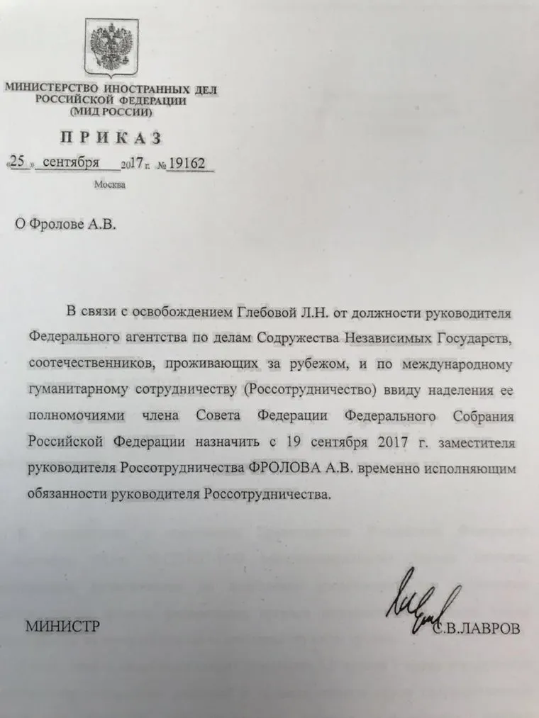 «Ввиду наделения ее полномочиями члена Совета Федерации Федерального Собрания Российской Федерации назначить с 19 сентября 2017 г. заместителя руководителя Россотрудничества Фролова А. В. временно исполняющим обязанности руководителя Россотрудничества», — следует из документа, который выложили в Telegram.