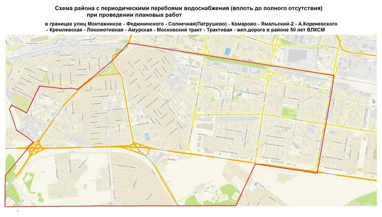 Перебои с водой вплоть до отключения заметят жители домов, которые находятся в границах от объездной дороги (Закалужчская — Федюнинского) до Транссибирской магистрали (проходящей вдоль улицы 50 лет ВЛКСМ), между улицами Московский тракт и улицей Монтажников, а также в границах улиц Интернациональной — Новосибирской — Московский тракт.