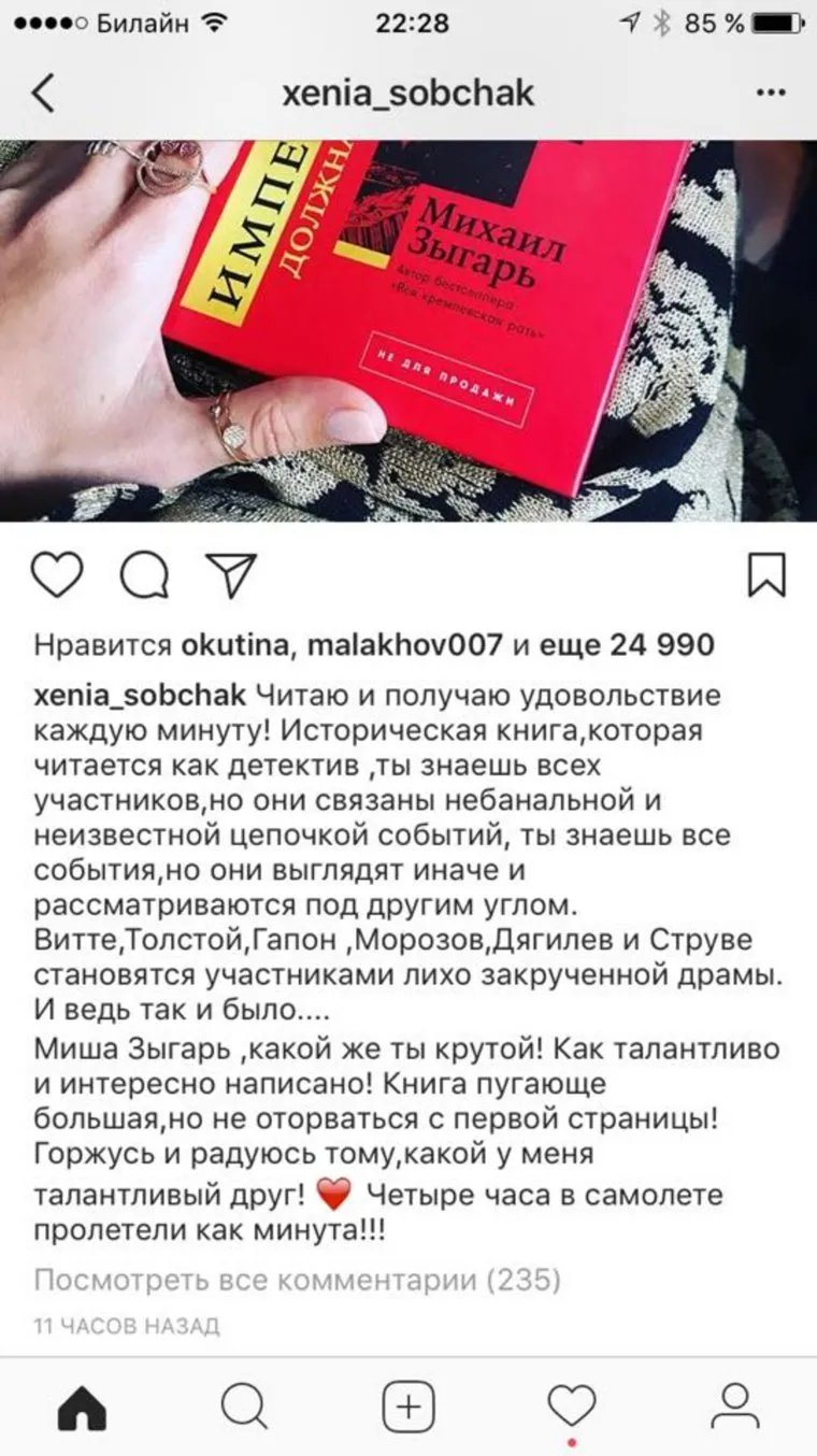 По его словам, он услышал слухи о назначении главой предвыборного штаба Собчак, когда был в Калифорнии. «Тут я, собственно, и проспал новость о том, что я, мол, стану главой предвыборного штаба Ксении Собчак. Когда проснулся, начал вспоминать. Хорошо помню, что мы в последнее время с кандидатом нередко общались. Более того, я даже дал кандидату интервью — для октябрьского номера журнала „Офисьель“. Правда, говорили мы исключительно про мою новую книгу. Которая кандидату, кажется, понравилась (вот пруфпик). На этом у меня все», — написал Михаил Зыгарь, прикрепив скриншот из аккаунта Собчак в nstagram.