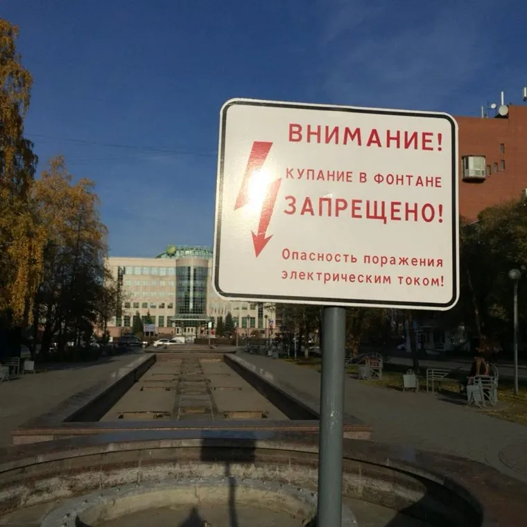 «Здоровье прежде всего, это всё, что надо знать о тюменских фонтанах, на заре новой октябрьской недели!», — написал автор снимка в Facebook (деятельность запрещена в РФ). На фотографии видна табличка с надписью: «Внимание! Купание в фонтане запрещено! Опасность поражения электрическим током!». Фонтан, при этом, уже не работает — он отключен на зиму.