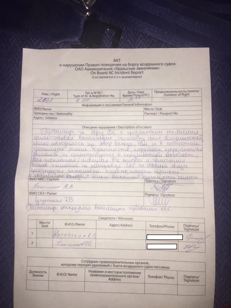 «Требования выйти сперва были лишь словесными: мол, стюардесса сказала: покажите билет — вы не показали, попросила пересесть — не пересели. Все, кто сидел рядом, я в том числе, слышали их разговор — такого не было. Пассажир просил предоставить основания для такого жесткого требования покинуть борт, и через сорок минут принесли акт, который вообще ошарашил нас, — рассказала „URA.RU“ пассажирка рейса. — В акте говорится, что нетрезвый человек мешал экипажу. Мы на обратной стороне акта написали претензию, и 18 пассажиров успели расписаться под ней».