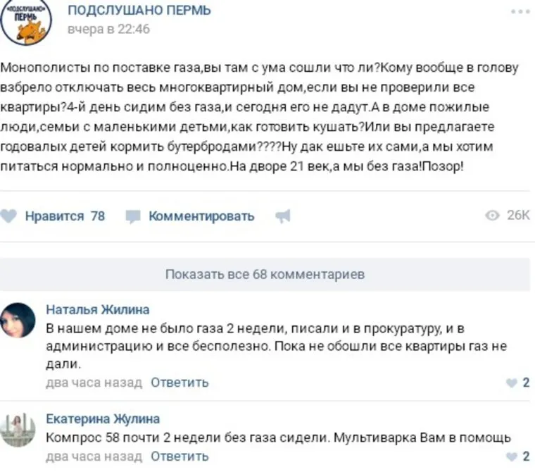 Аналогичные истории активно обсуждают и в социальных сетях. Так, в группе «Подслушано Пермь» социальной сети «ВКонтакте» несколько десятков пользователей заявили об отключениях газа в их домах. В некоторых случаях пермяки живут без газа больше месяца.
