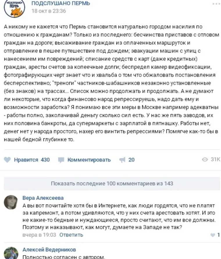 В группе «Подслушано Пермь» в социальной сети «ВКонтакте» развернулось обсуждение на тему «Пермь становится городом насилия». Автор-аноним, начавший дискуссию, отмечает, что в столице Прикамья бесчинствуют судебные приставы, пассажиров высаживают из маршруток, со счетов граждан списывают средства, «беспредельничают» камеры видеофиксации.