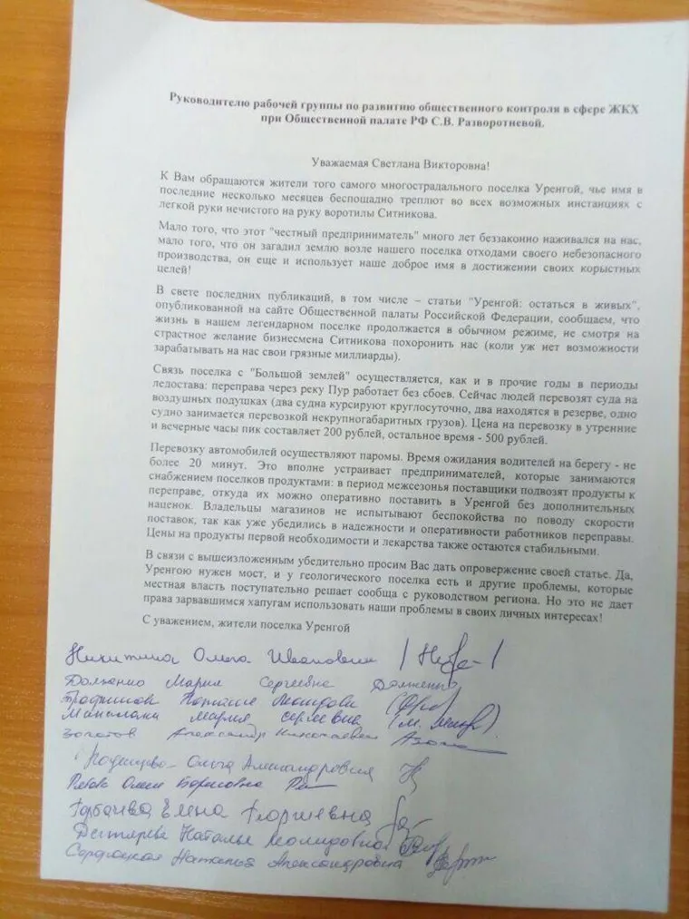 Жители Уренгоя (ЯНАО) написали обращение в Общественную палату РФ с просьбой дать опровержение статье, в которой сообщается о вымирании поселка. Они утверждают, что общественники попались на уловки ямальского бизнесмена Олега Ситникова, который до недавнего времени наживался на жителях поселка благодаря незаконной переправе.