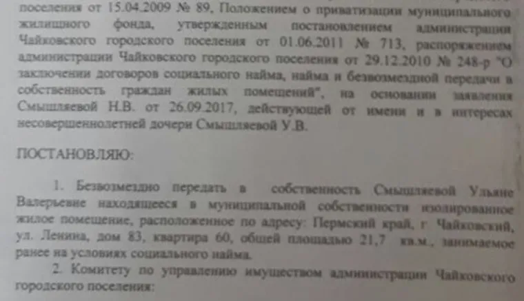 Между тем в соцсетях появились фото документов, согласно которым глава Чайковского Алексей Третьяков принял постановление о безвозмездной передаче одной из муниципальных квартир в собственность несовершеннолетней, носящей ту же фамилию, что и председатель комитета по управлению имуществом. Девушке досталось жилье площадью 21,7 квадратных метра. В документе говорилось, что ранее несовершеннолетняя занимала квартиру на условиях социального найма. Контроль исполнения решения возложен на Наталью Смышляеву. Источники утверждают, что чиновница и девочка, фигурирующая в документе, не просто однофамилицы, а мать и дочь.
