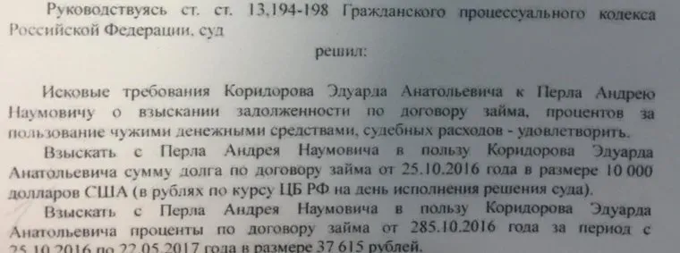 Решение суда, которое подтверждает, что Перла должен вернуть крупную сумму Коридорову