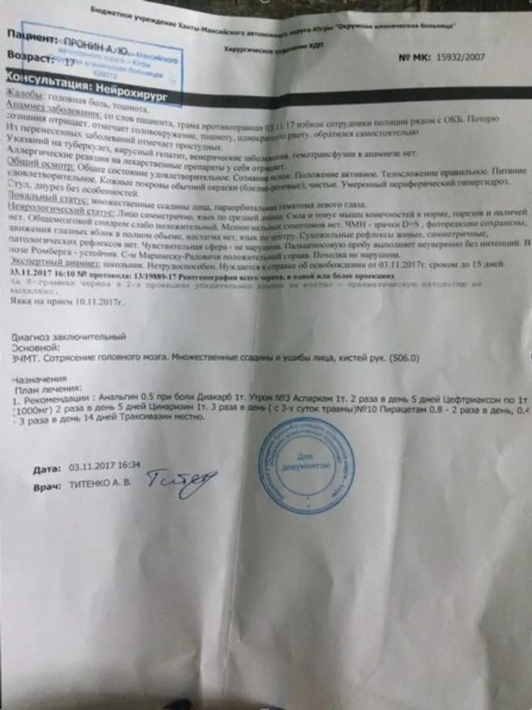 «На моего сына и двух его друзей внезапно напали неизвестные лица от трех до пяти человек в гражданской одежде. Сразу завалили на землю, применив удушающий прием. Выражались нецензурной бранью, обещали „лицо сломать“. Естественно, сын испугался, что на него напали какие-то бандиты, пытался вырваться и оказать сопротивление. В ответ его вновь повалили на землю и били ногами по голове, отчего у него сейчас все лицо в ушибах, синяках и царапинах, и не только лицо. В ОКБ при снятии побоев диагностировали сотрясение мозга, его до сих пор мучают головные боли и тошнота», — рассказывает «URA.RU» Оксана Тимофеева.