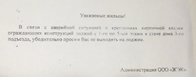 Жильцам предложили самостоятельно решить вопрос ремонта, а пока просто не ходить на лоджии