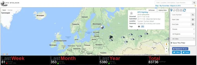 В Сети появилась «карта вторжений НЛО» в Россию. СКРИН
