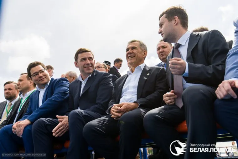 Гости областного Сабантуя в «Белой лошади». Слева направо — вице-премьер правительства Башкортостан Салават Сагитов, губернатор Свердловской области Евгений Куйвашев, президент Татарстана Рустэм Минниханов, генеральный директор клуба «Белая лошадь» Илья Тугбаев