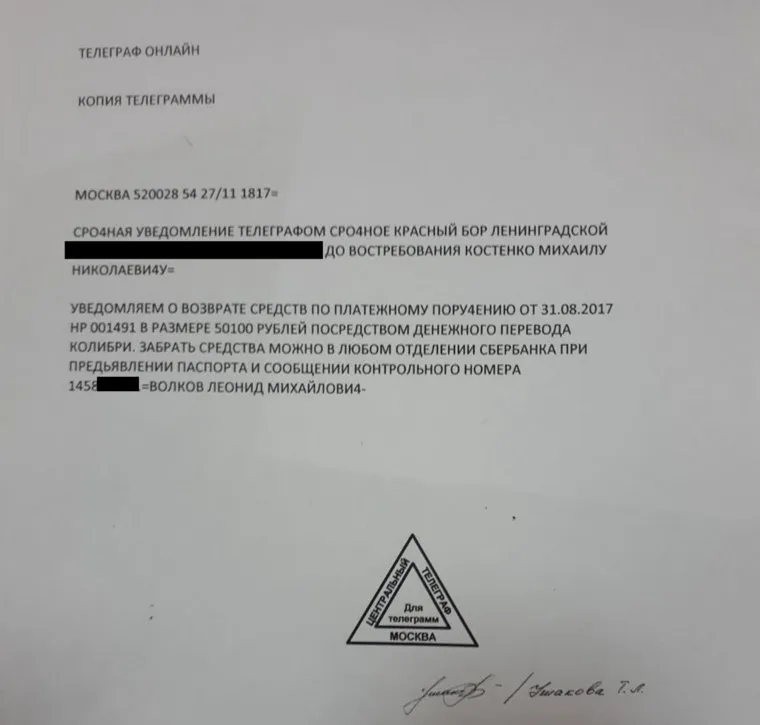 Волков еще до суда отправил истцу в Ленинградскую область телеграмму, в которой уведомил Костенко о том, что деньги он может получить в любом отделении Сбербанка. «Уведомляем вам о возврате средств по платежному поручению от 31.08.2017 года НР 001491 в размере 50100 рублей посредством денежного перевода „Колибри“. Забрать средства можно в любом отделении Сбербанка при предъявлении документа удостоверяющего личность и сообщении контрольного номера», — говорится в телеграмме.