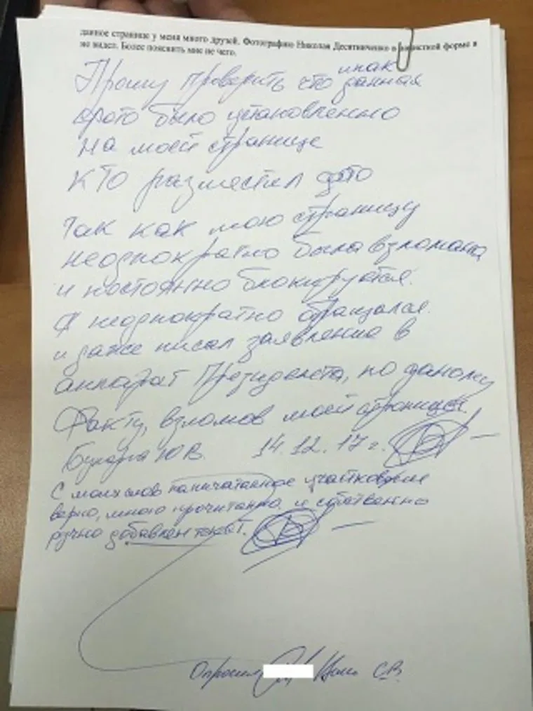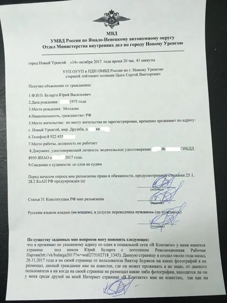 В объяснении Буларги, данном полиции, которое заверил участковый уполномоченный ОУУП и ПДН ОМВД России по г. Новому Уренгою, старший лейтенант полиции Сергей Цысь, обвиняемый указал, что его страницы в соцсетях «Одноклассники» и «ВКонтакте» были взломаны два месяца назад, о чем он даже написал жалобу президенту РФ.