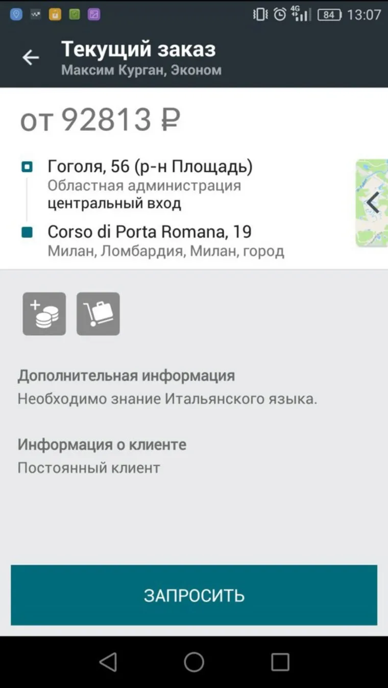 В заявке указывается, что автомобиль должен подъехать к центральному входу правительственного здания Кургана и отвезти клиента по адресу в Милане. Пассажир уточнил, что поедет с багажом и готов доплатить водителю сверх назначенной цены. Также в особых пожеланиях неизвестный, который, судя по заявке, является постоянным клиентом такси, попросил откликнуться водителя со знанием итальянского языка. «Корпоратив удался», — иронизирует шофер.