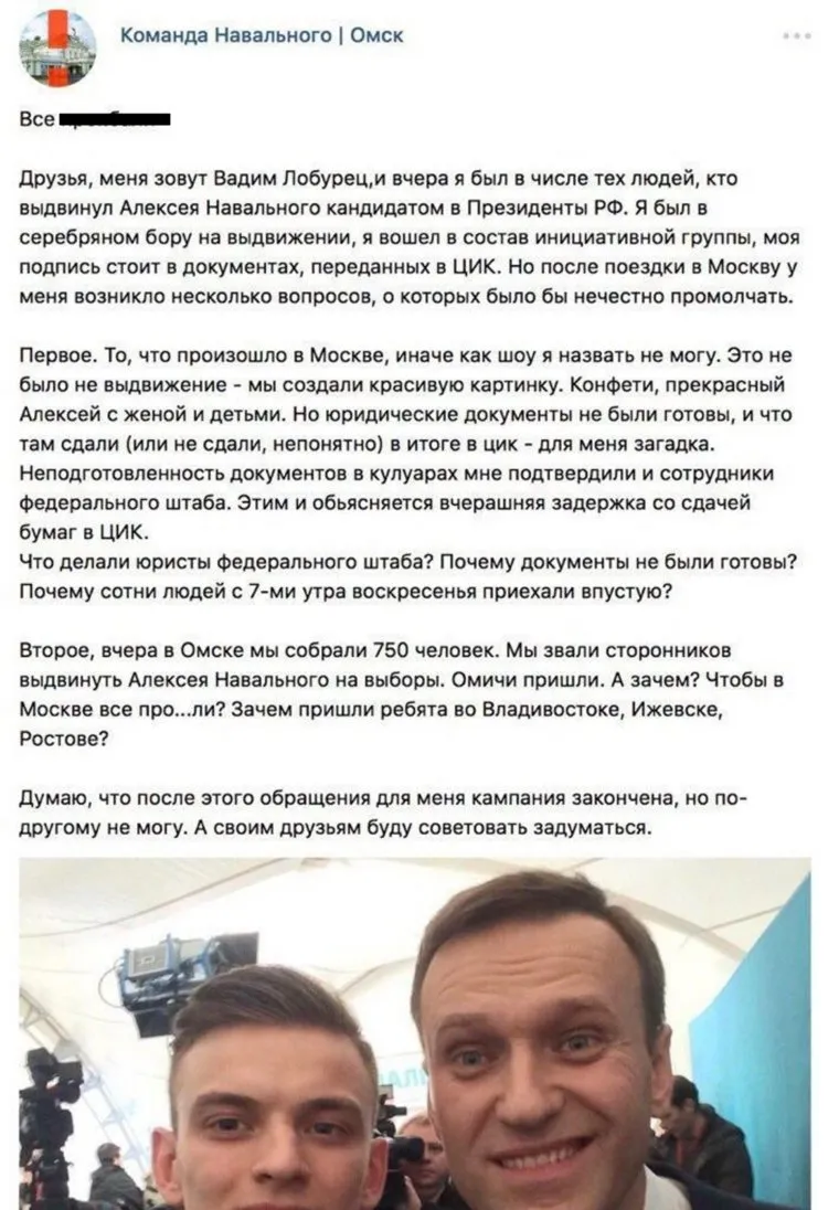 Молодой человек опубликовал пост в паблике «Команда Навального. Омск». По его словам, процедура выдвижения Навального была лишь красивой картинкой. Юристы штаба блогера, по мнению молодого человека, не подготовили вовремя нужные документы. Из-за этого возникла задержка с подачей бумаг в ЦИК.