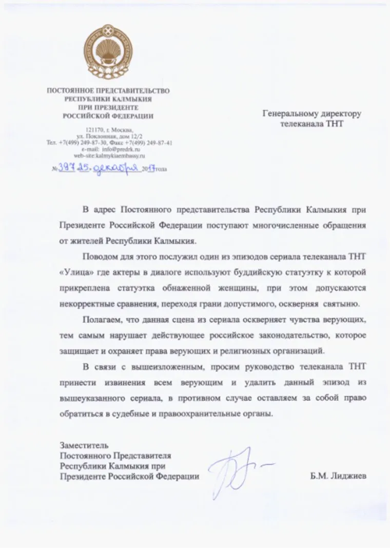 Руководство телеканала «ТНТ» попросили удалить эпизод из сериала «Улица» из-за шутки про буддийскую статуэтку, к которой прикреплена статуэтка обнаженной женщины. Официальное обращение на имя гендиректора направил заместитель постпреда Республики Калмыкия при президенте РФ Баатр Лиджиев.