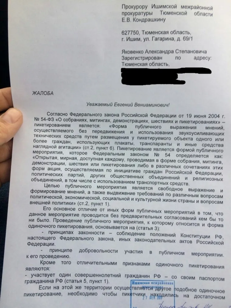 «Никто так и не признался, за какое правонарушение меня задержали. Сказали, что позвонили граждане. В дежурной части мне тоже пояснений не дали, повернулись спиной и не реагировали на просьбы», — сказал Александр Яковенко. После происшествия он вернулся к месту пикета и достоял там оставшиеся там 15 минут. 27 декабря активист написал заявление в прокуратуру с просьбой проверить законность действий ишимской полиции.