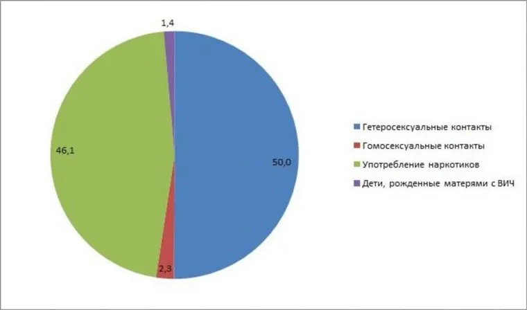 Половой путь передачи ВИЧ-инфекции преобладает в стране. «Среди впервые выявленных в 2017 году ВИЧ-позитивных 50,0% инфицировались при гетеросексуальных контактах, 2,3% — при гомосексуальных контактах, 46,1% — при употреблении наркотиков нестерильным инструментарием. 1,4% приходилось на детей, рожденных ВИЧ-инфицированными матерями», — указано в справке федерального центра СПИДа. За 10 месяцев зарегистрировано 12 случаев с подозрением на заражение ВИЧ при оказании медпомощи и 12 случаев — в местах лишения свободы «при использовании нестерильного инструментария в немедицинских целях» (при набивке татуировок).