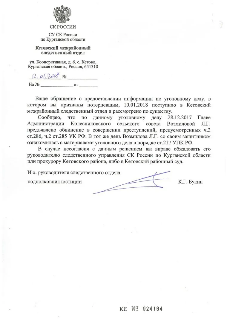 Несмотря на то, что о махинациях Возмиловой было давно известно жителям сельсовета, уголовное дело по факту превышения должностных полномочий возбудили лишь весной 2017 года. Источник, попросивший сохранить его имя в тайне, предоставил «URA.RU» документы, в которых указывается, что следователь Кетовского межрайонного отдела отказал в возбуждении уголовного дела по заявлению о присвоении и растрате бюджетных средств Колесниковского сельсовета. Позже это постановление отменило областное следственное управление.