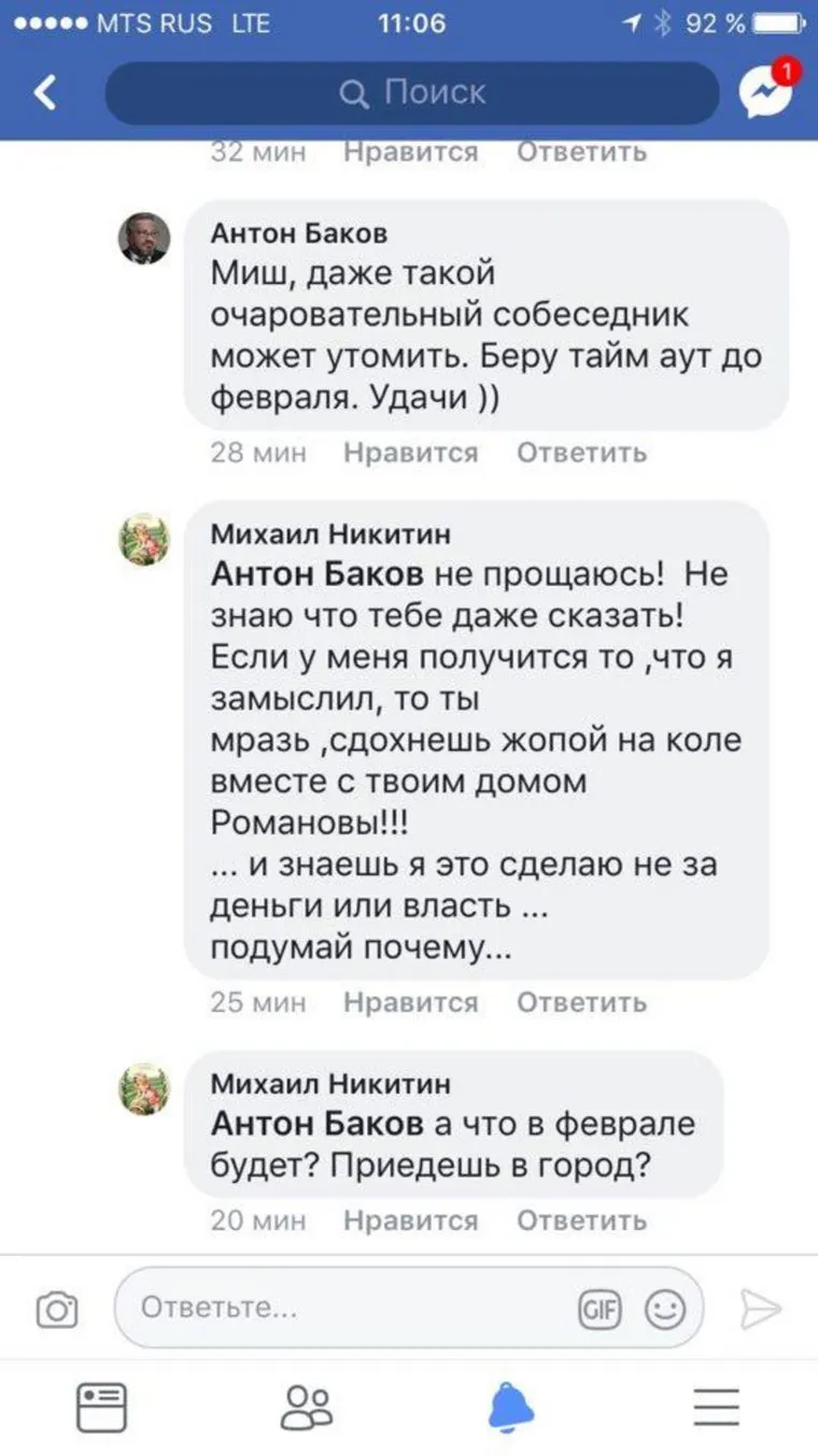«Антон Баков, не прощаюсь! — написал Михаил Никитин. — Не знаю, что тебе даже сказать. Если у меня получится то, что я замыслил, то ты, мразь, сдохнешь жопой на коле вместе с твоим домов Романовых!!! … и знаешь, я это сделаю не за деньги или власть».